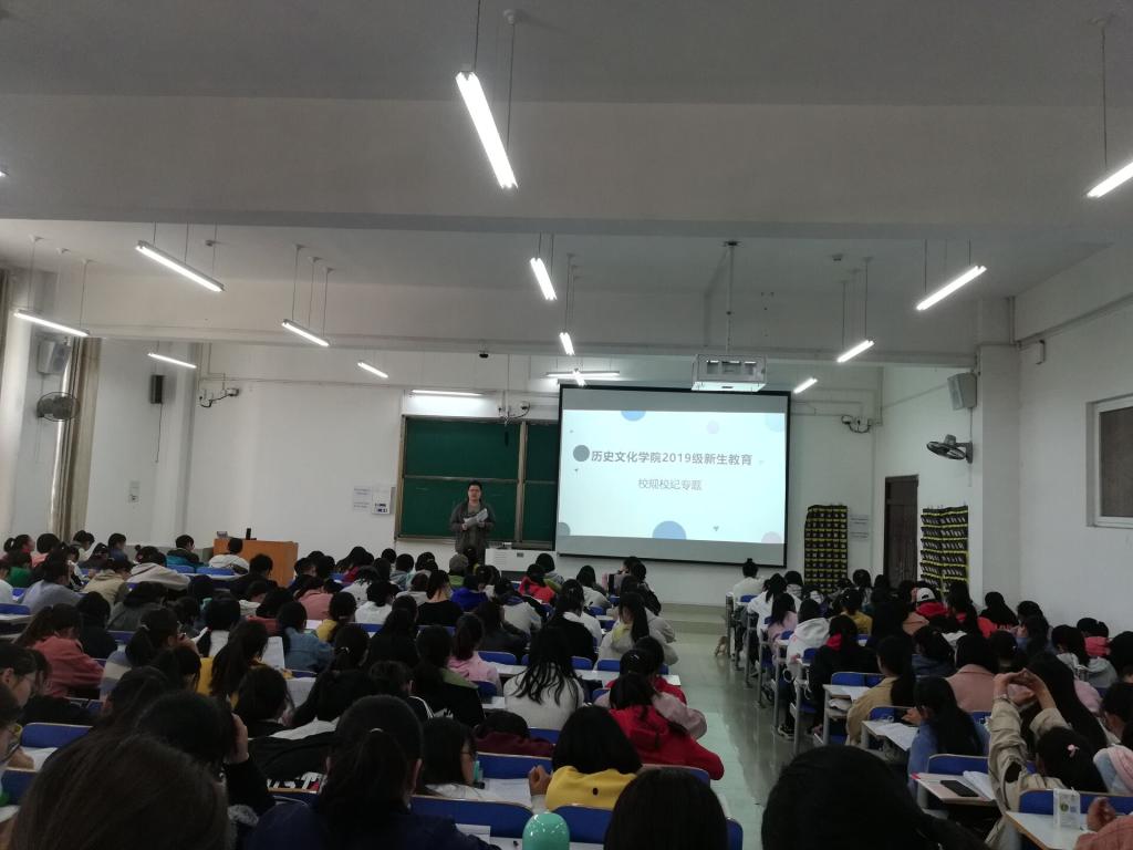 王道歆以《信阳师范学院学生工作制度汇编》《思想政治材料选编-校规校纪专刊》为核心,从政策法规、学生管理、奖惩办法、资困助学、心理健康等方面进行了讲解。重点解读了学生违纪处理办法,并结合了近几年来发生在学校中的典型违纪事件,强调了遵守校规校纪的重要性,特别是考试作弊和寝室存放违禁物品等问题的严重性,希望学生从自身角度出发,一定要认真学习并遵守各项校规校纪,培养自我学习、自我管理的能力,成为有理想、有道德、有文化、有纪律的合格人才。